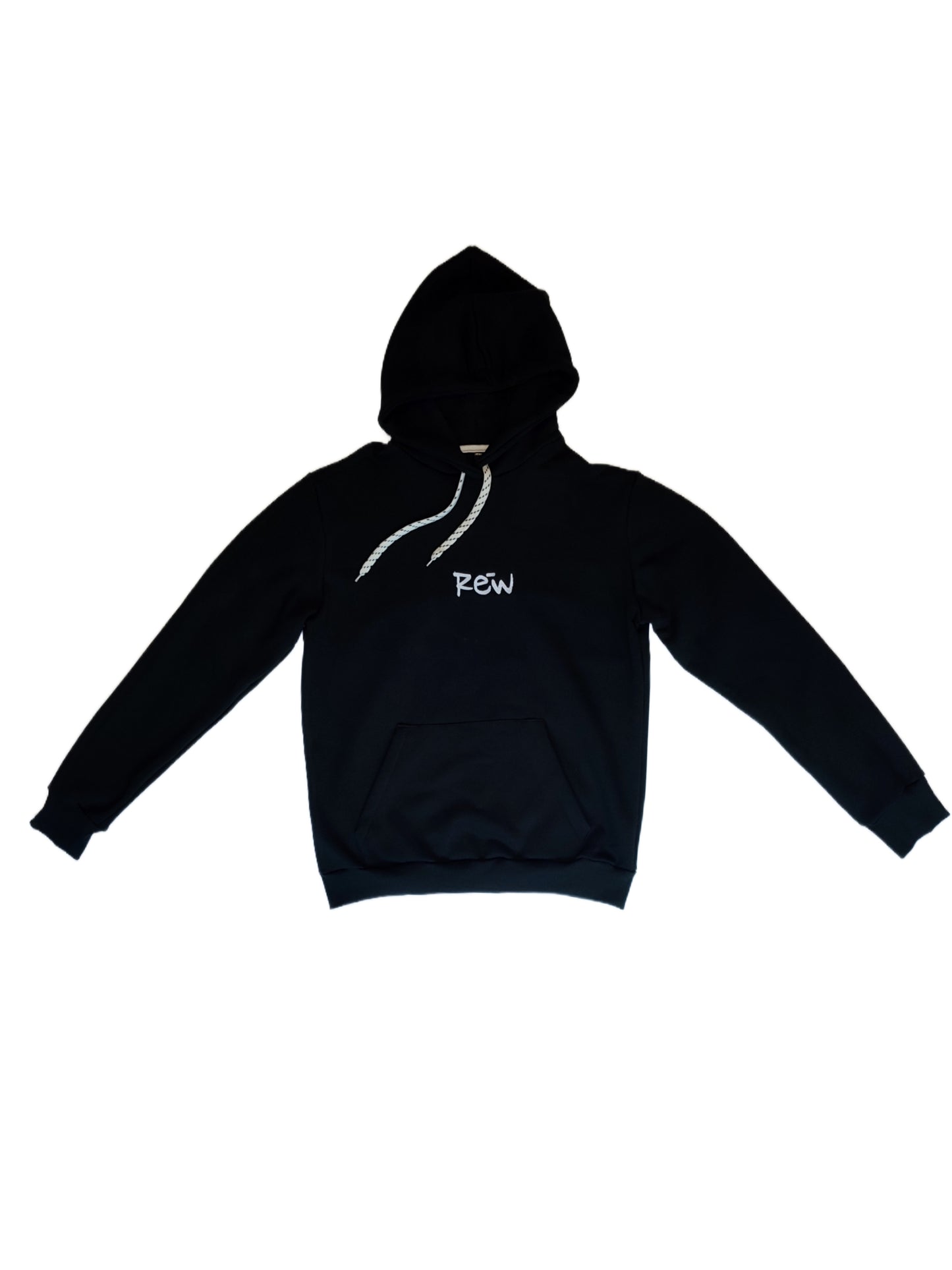 Oversized black hoodie decorated with white "Rew" embroidery on the chest .